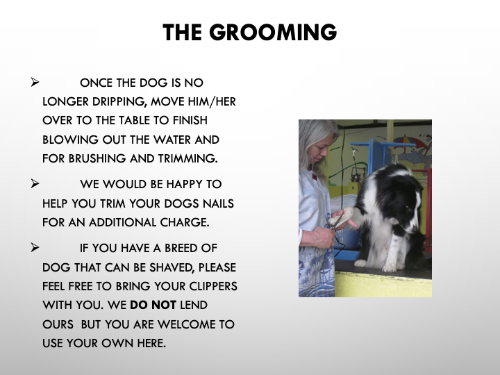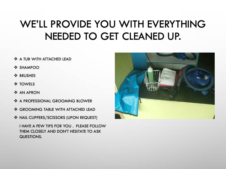 - Slicker & / or pin brushes, undercoat rakes, combs, and rubber scrubbies (great for creating lather and loosening up that shedding coat!). We also have an assortment of nail clippers and scissors, available upon request.