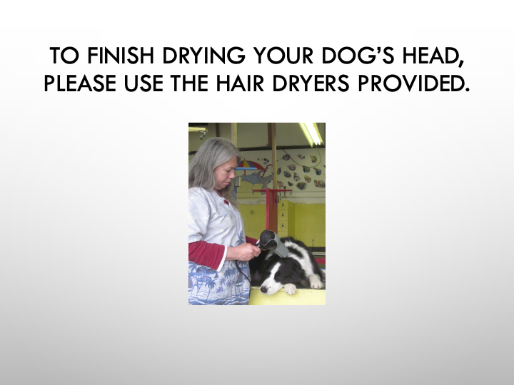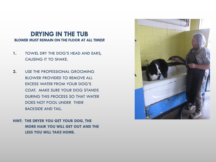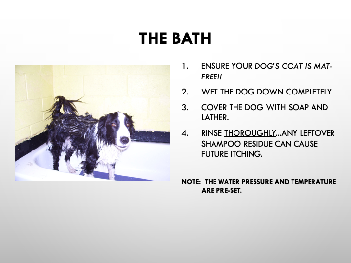 Our tubs are raised so no more back pain crouching over your bathroom tub (we even have an extra high tub for those of you over 6 ft tall!). We have stairs that the dogs can use to get into the tub and there is always someone available that can assist in lifting those reluctant pooches.